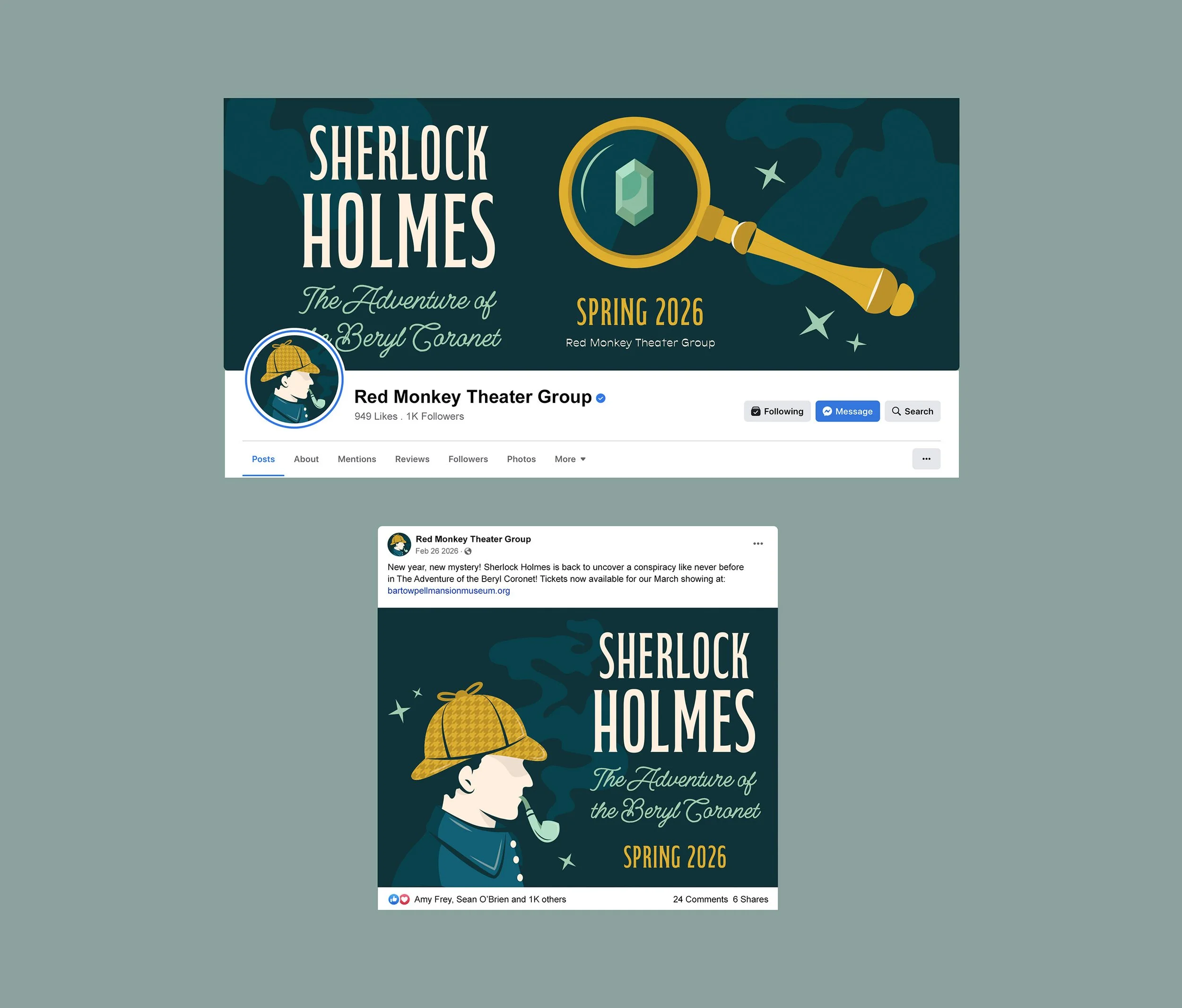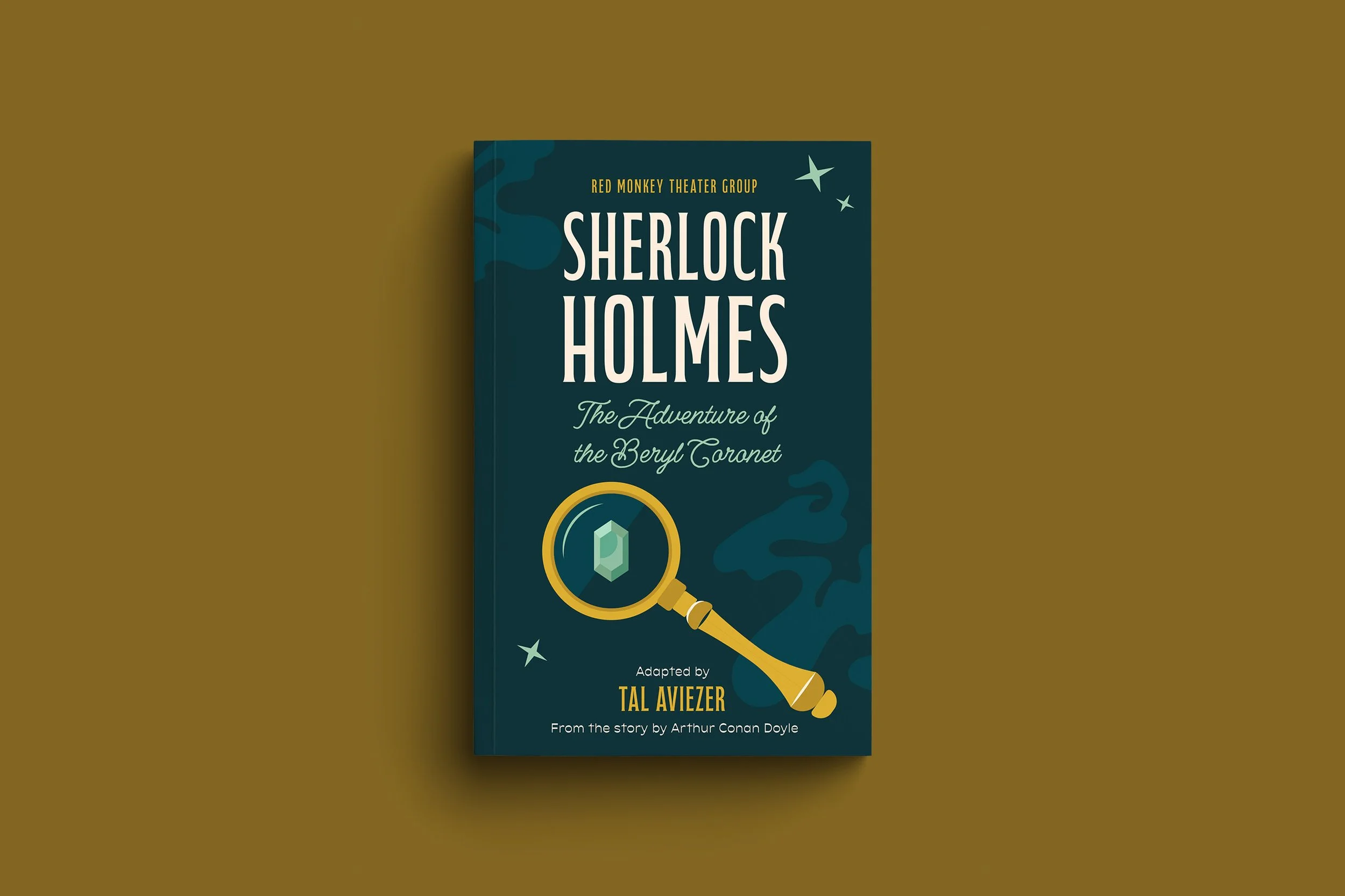 Featuring a magnified beryl gem as the focal point, this design draws viewers into the heart of the mystery. Sparkling accents subtly reference the missing stones, while my signature Sherlock Holmes illustration ensures continuity across the Red Monkey Theater Group’s Sherlock series.